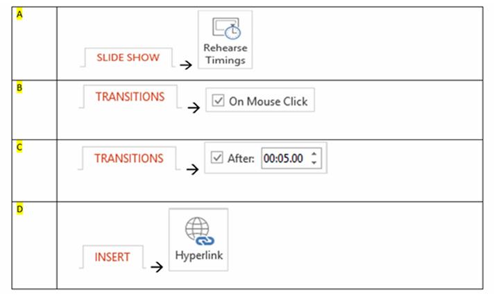 Q11. There are 15 slides in your presentation. The Slide Show must transit to the next slides automatically without pressing the “ENTER” key. How would you achieve that?