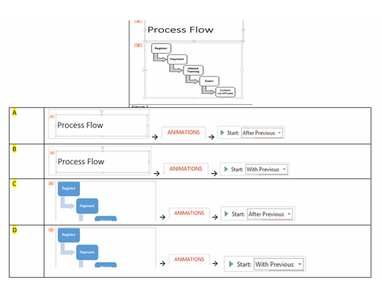 Q13. The slide in Figure 1 has been applied with animation. You would like object number 2, the “”Process Diagram”” to animate immediately after “”Title””. How do you achieve that?