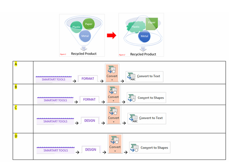 Q14. Which method allows you to change your current SmartArt diagram to shapes that can be moved, resized or deleted independently?