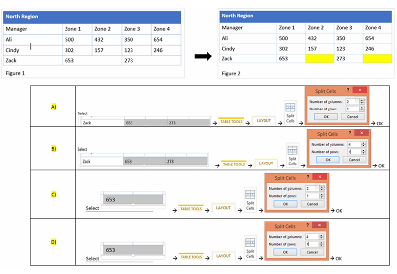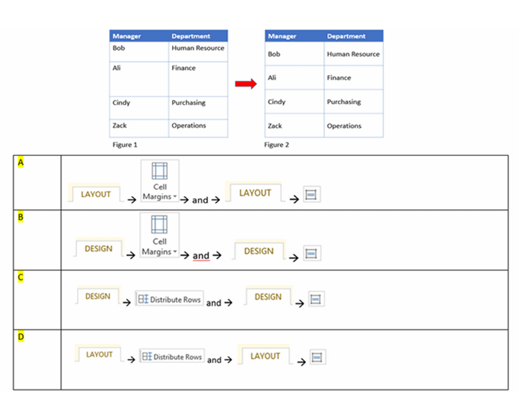 Q16. The table has 4 rows as shown in Figure 1. You would like to evenly distribute the height of every row as depicted in Figure 2. Which answer will achieve it?