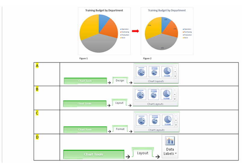 Q17. You have created a pie chart depicting training budget by departments in Figure 1. You would like to add a percentage of allocation to the pie chart as shown in Figure 2. You may select more than one answer.