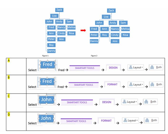 Q18. The organization chart shown in Figure 1, is biased heavy on the left side. You want to rearrange the subordinates under John as shown in Figure 2. How can you achieve this?