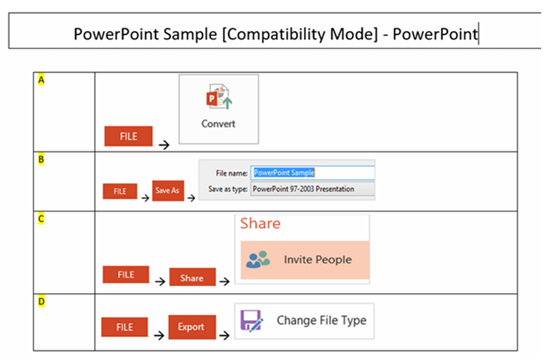 Q19. You need to share your presentation with users who are using lower than PowerPoint version 2010. How do you convert the file so that it becomes compatible for them to view and edit, with the label [Compatibility Mode] shown on the title bar?