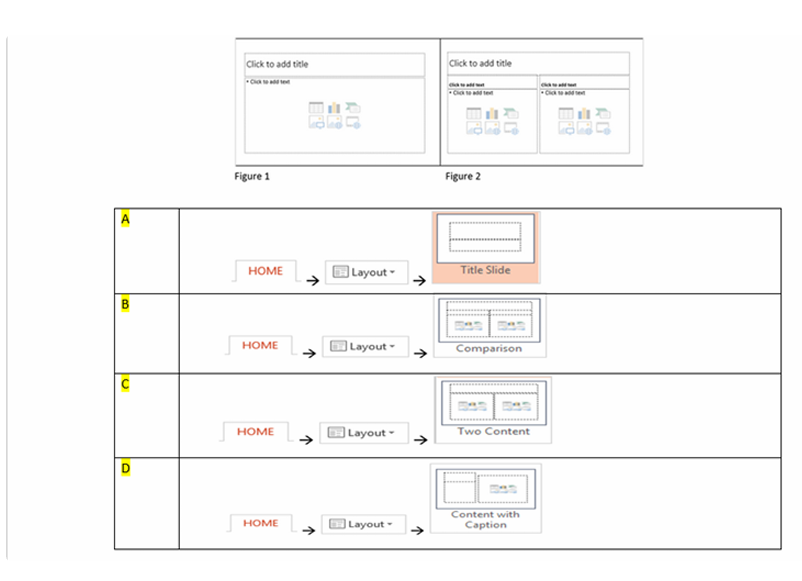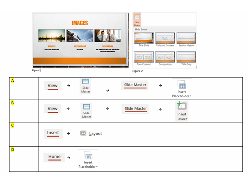 Q38. You would like to create new presentation layout (depicted in Figure 1) to be used globally in your presentation. So that the layout appears in the new slide drop down (depicted in Figure 2). Which of these answers allow you to do it?