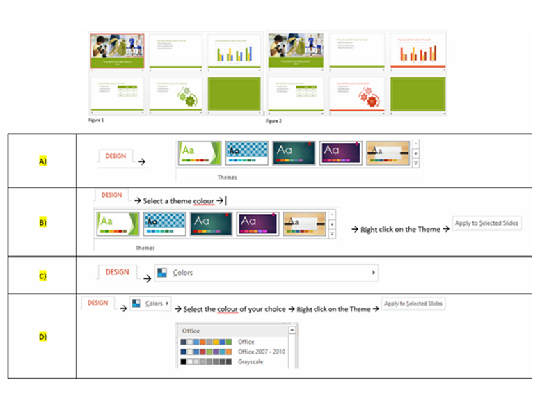 Q24. The six slides below in Figure 1, are using are using Green theme colour. How do you change the theme colour for few slide, as show in Figure 2?