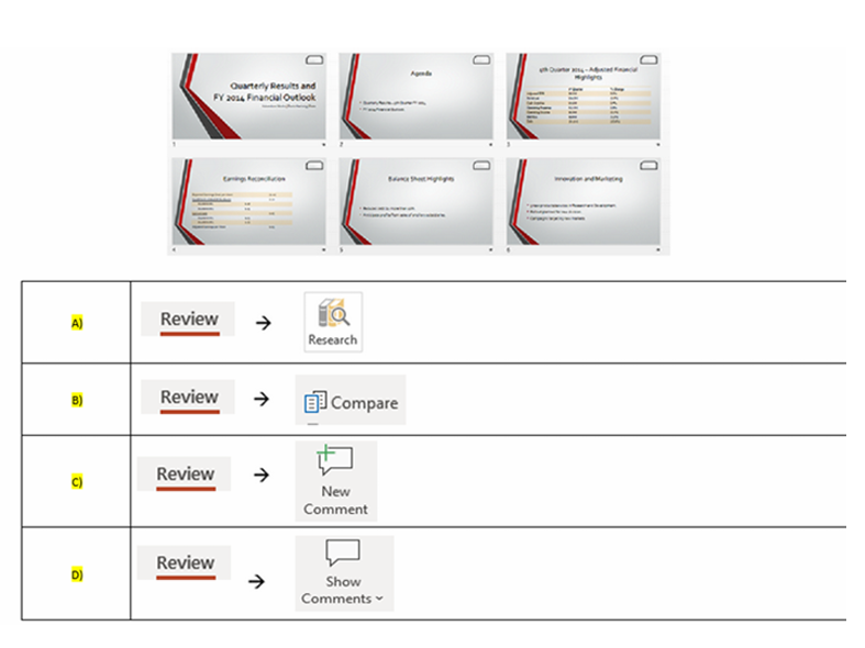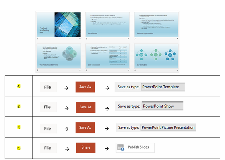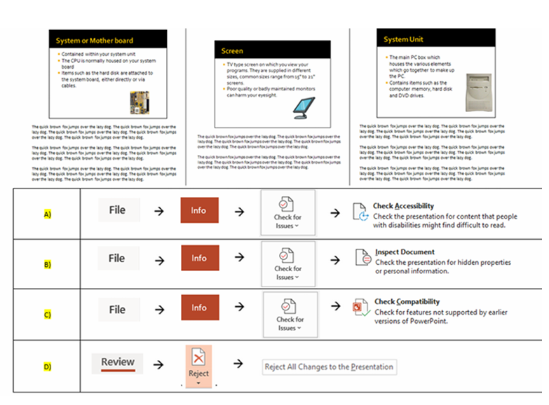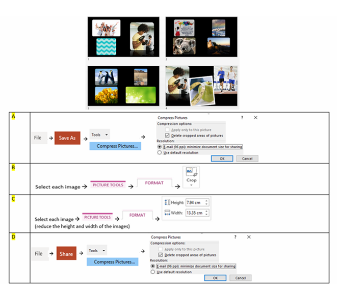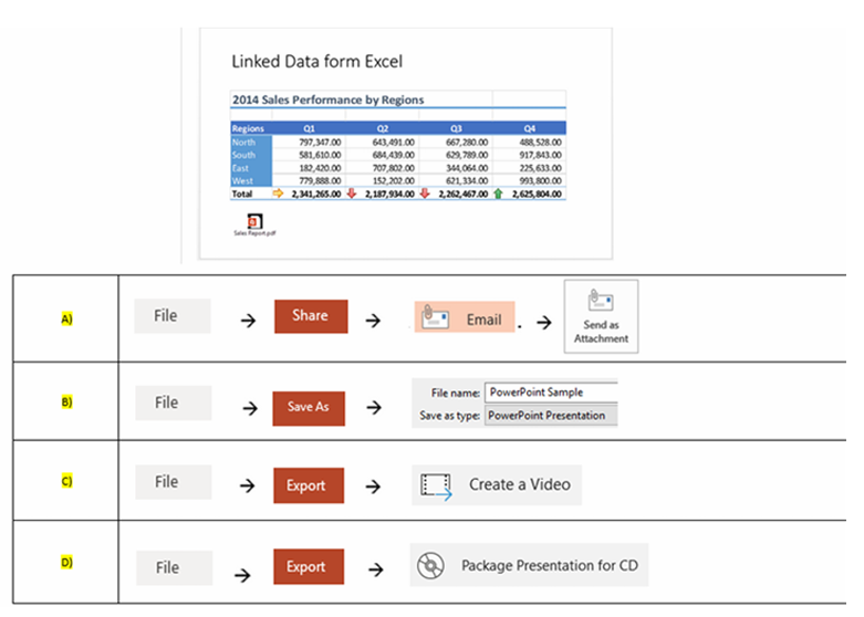 Q25. The presentation below contains images. You need to send this presentation to your colleague via email. You can’t send it, unless you reduce the size of the images. Which answer will be fastest method to achieve this?