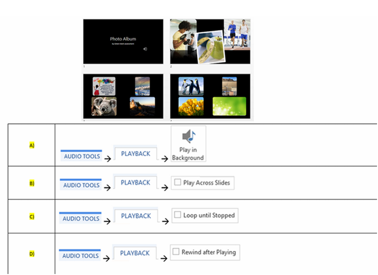 Q26. You have inserted an audio file into the first slide. You would like the audio to play continuously for all the slides in the presentation. How can this be achieved?