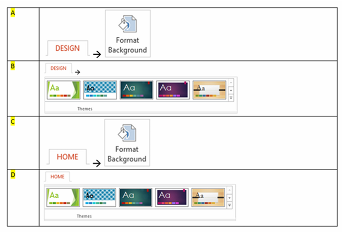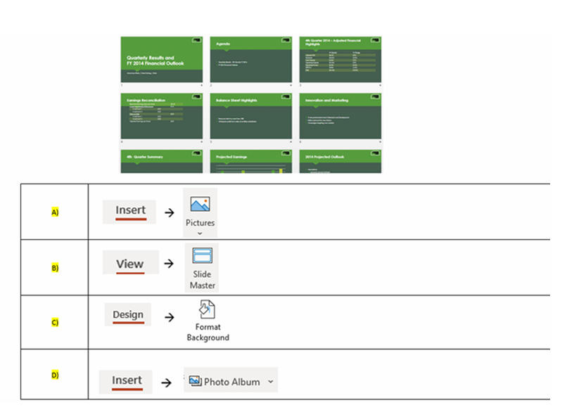 Q3. You have a presentation with 10 slides. You want to quickly format the presentation with a background design. Which of the following methods would you use?