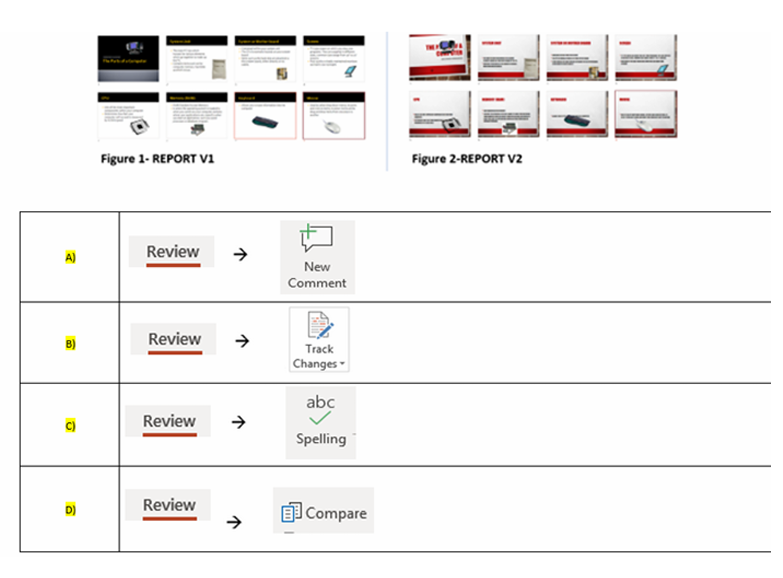 Q29. You have prepared your company’s quarterly report and it is save as “”REPORT V1″”. You would like your immediate superior to review your presentation. Your immediate superior has done some changes to the presentation and saved it as “”REPORT V2″”. You have likewise made some changes in the “”REPORT V1″” file. How do you reflect the final presentation with both changes in it?