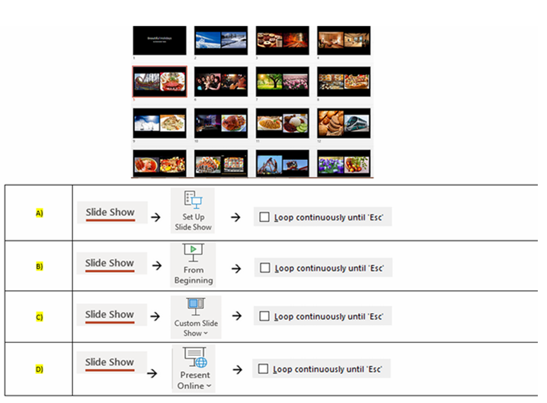 Q30. You are running a half day event. You want all your slides to play continuously. Which of the following answers allow you to achieve it?