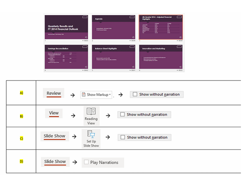 Q32. You have recorded a narration in the slides below. How do you start the Slide Show without the narration? You may select more than one answer.