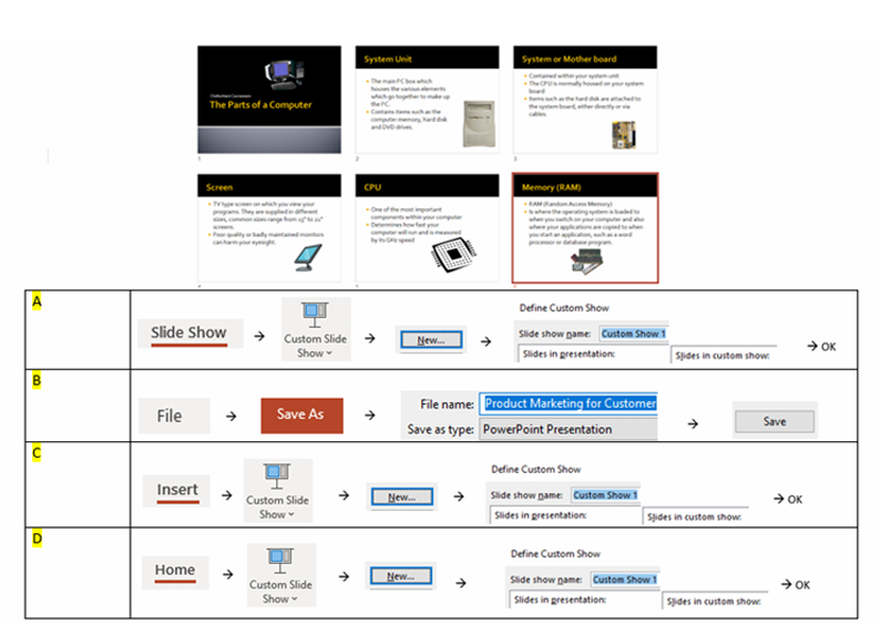 Q35. You have 6 slides for your Marketing presentation. You need to eliminate 2 slides from the current Marketing presentation for “”Customer”” group. How do you create the presentation for “”Customer”” group?