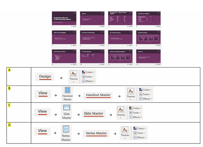 Q36. As the company’s presentation designer, you are asked to revamp the current Financial Report presentation with a new global corporate design and colour scheme. How do you do this?