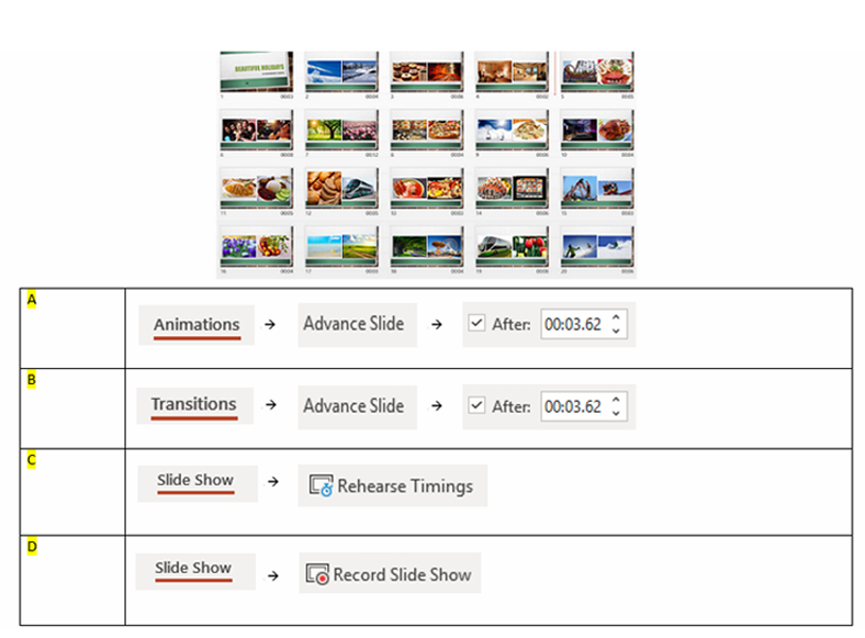 Q39. You would like you presentation to run automatically according to the timings shown below. How do add these different timing for each slide?