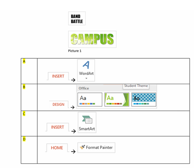 Q4. You would like to format the word “”BAND BATTLE”” as shown in the picture below, to the formatting shown in in Picture 1. Which of the answers below, would be the fastest method?