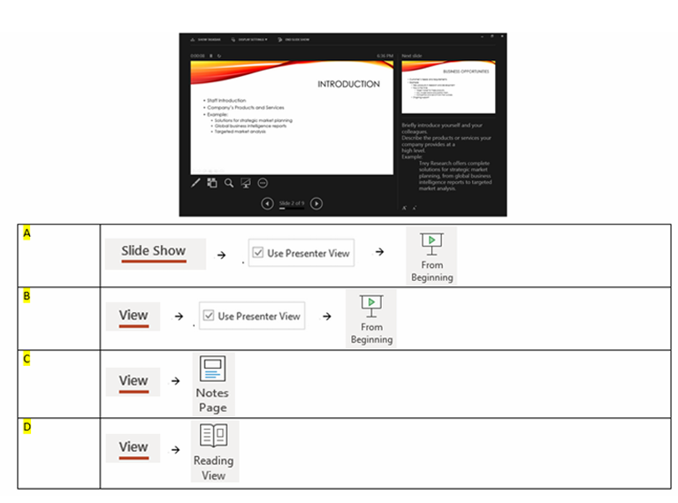 Q40. When running slide show, you would like to view your notes during presentation. How do you create the view as shown below?