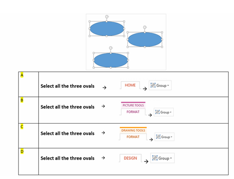 Q6. There are three oval shapes in slides. You would like to group all three oval shapes together. Which of the following answer will allow you to achieve that?