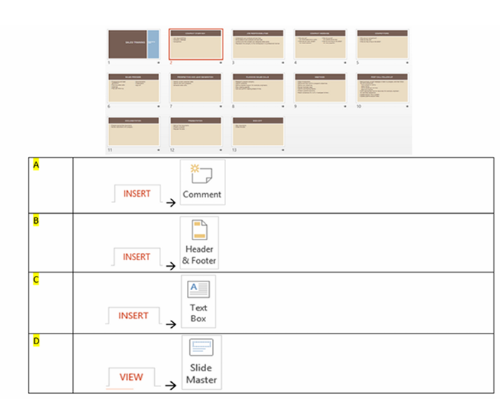Q7. There are 13 slides in your presentation. You would like to insert your Company name in all slides. Which method will allow you to insert the company name to all the slides?