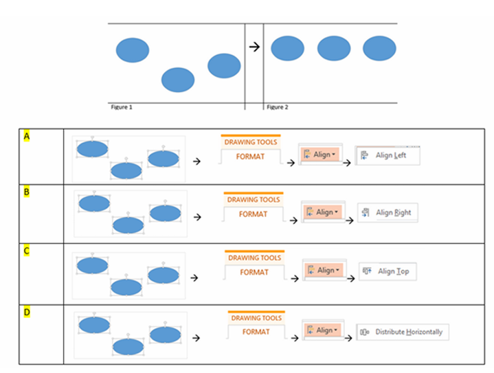 Q9. There are three oval shapes on slide as per Figure 1. How do you arrange the shapes horizontally as per Figure 2?
